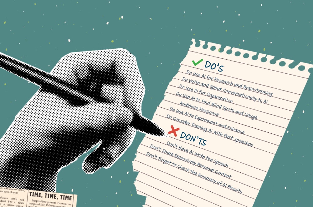 AI should not write your speech. Doing so removes your personal insight and experiences and deprives the audience of your perspective and experiences. “AI can’t provide that originality,” says McGhee, who gives roughly 20 speeches per year in his professional and Toastmasters capacities and usually uses AI to help prepare.